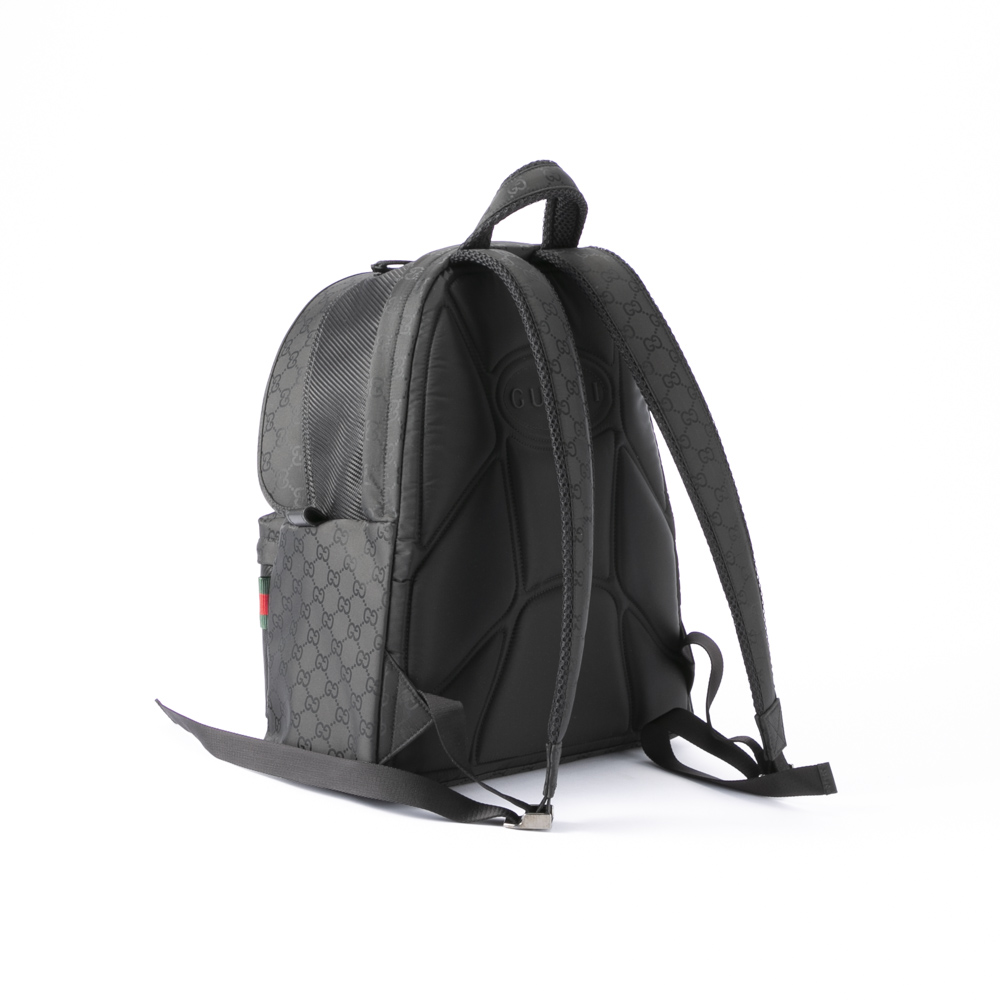 こちらのバックパックは、ソフトでありながら耐久性に優れた洗練されたブラックのナイロンで仕立て、全体にGGパターンをあしらっています。