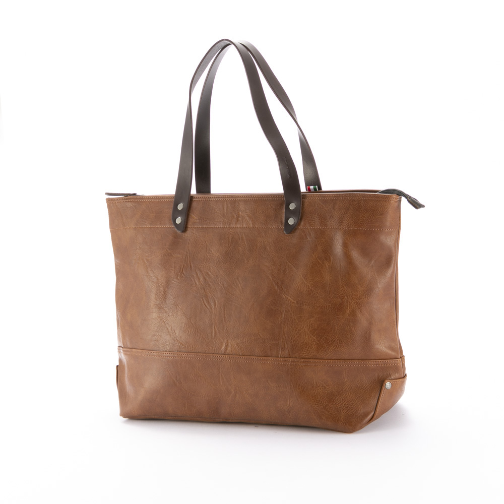 本体は高級感のあるフェイクレザーを使用し、持ち手とショルダーにはイタリアンヌメ革を、ファスナーの引き手部分にもレザーを使用することでワンランク上の大人な雰囲気に仕上げました。