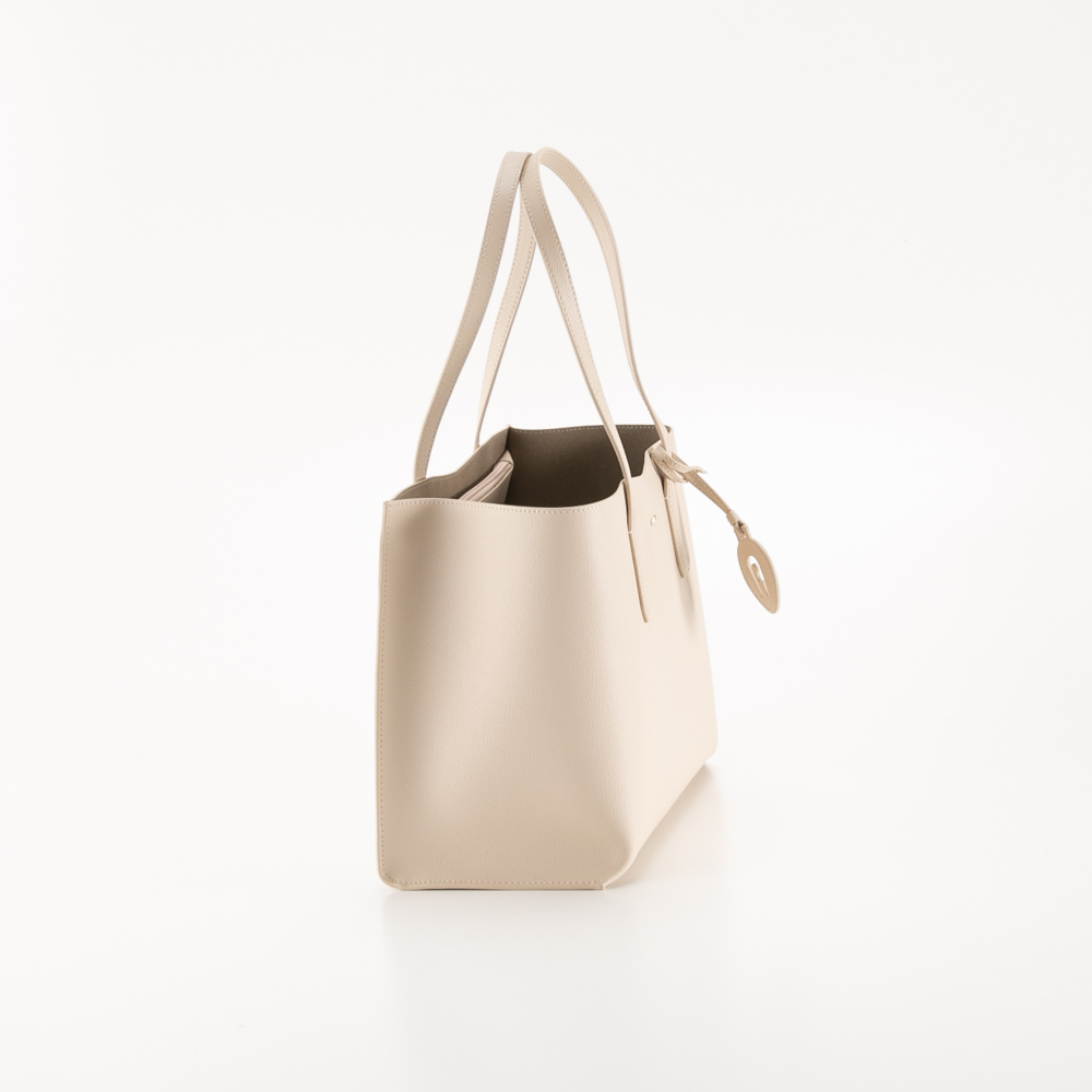 品のあるカラーにメタルロゴをあしらったベーシックなデザインのトートバッグ。