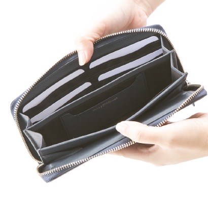 外ポケットも内ポケットも充実していて、小物を仕分けしやすく便利。スリムなフォルムですが、長財布も余裕で入る収納力!